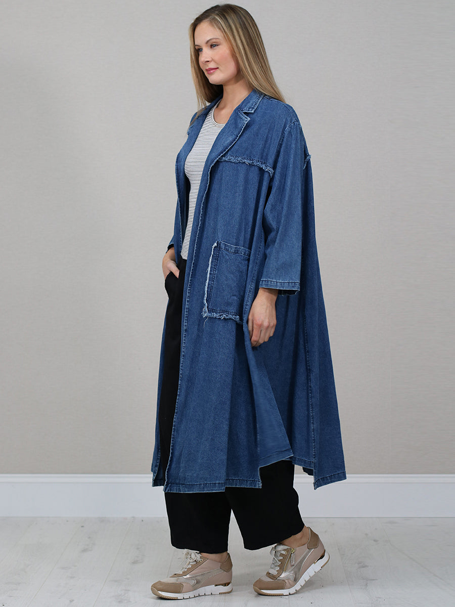 A versatile, longline, and oversized denim jacket offering a stylish yet casual look suitable for layering over various outfits for different seasons.