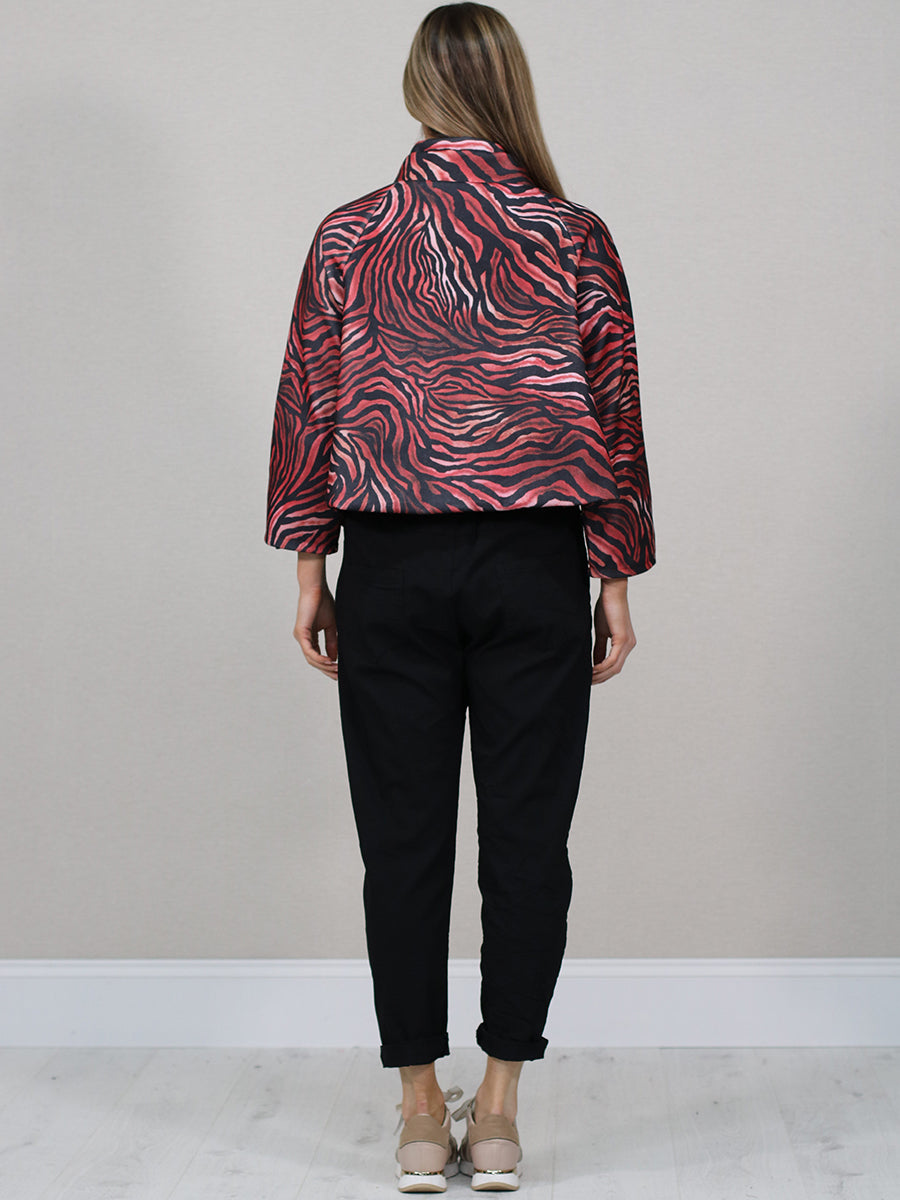 This modern cropped jacket showcases a vibrant crimson animal-wave pattern with a sleek minimalist silhouette. Finished with a soft folded collar and clean single-button closure—ideal for styling over sleek dresses or tailored pants.