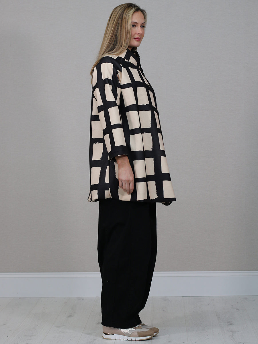 This is a stylish mid-length coat featuring a bold, abstract grid pattern in black and beige. The design uses large, brush-stroke-style squares that create an artistic, modern look.