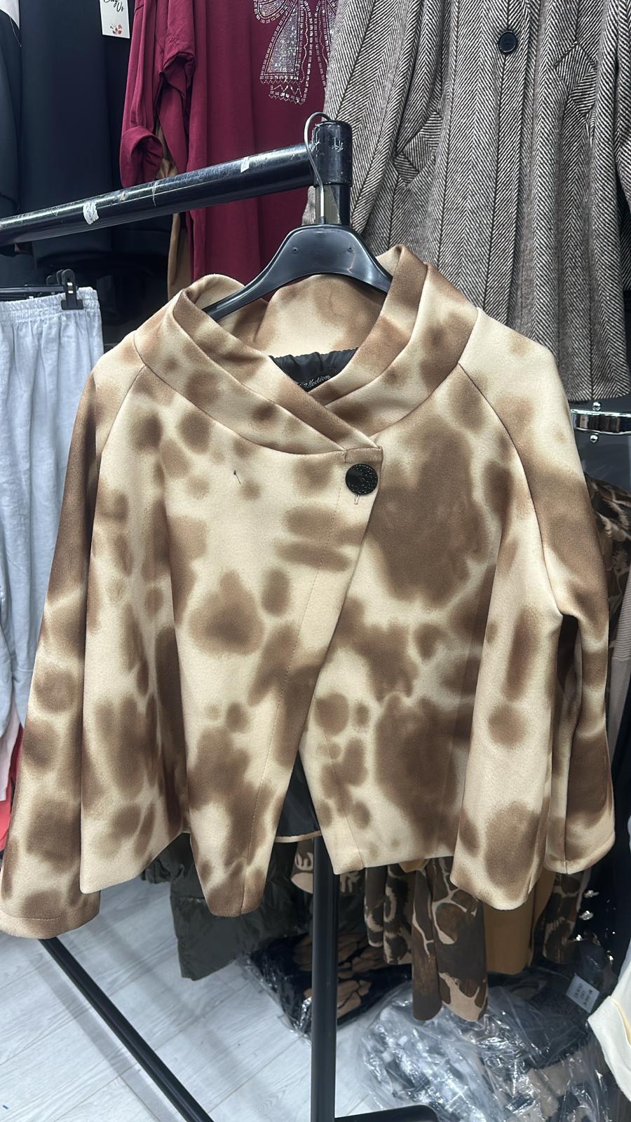 Inspired by natural desert hues, this cropped blazer features an airy brown mist pattern on satin-finish fabric. Its structured collar and modern silhouette make it a standout piece for both daytime sophistication and evening charm.
