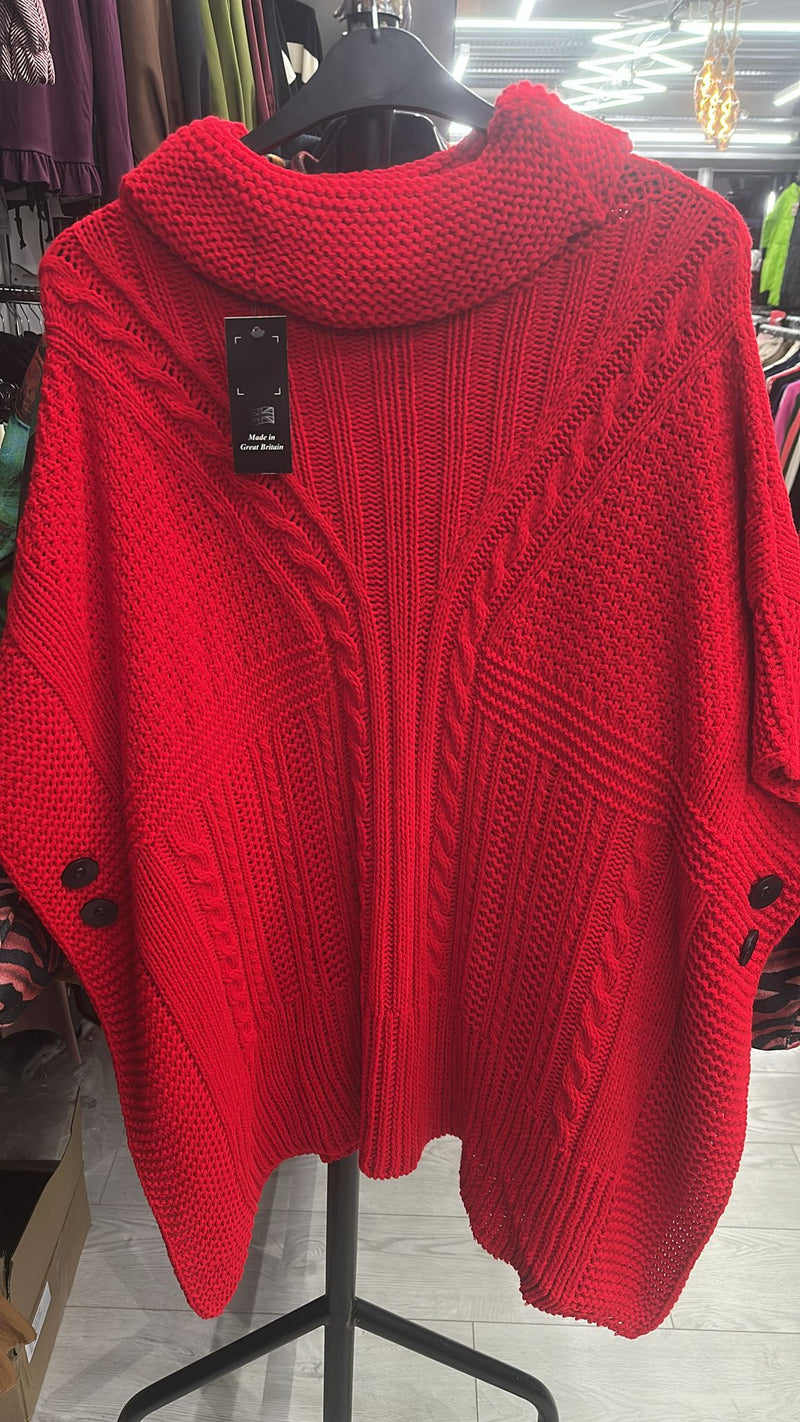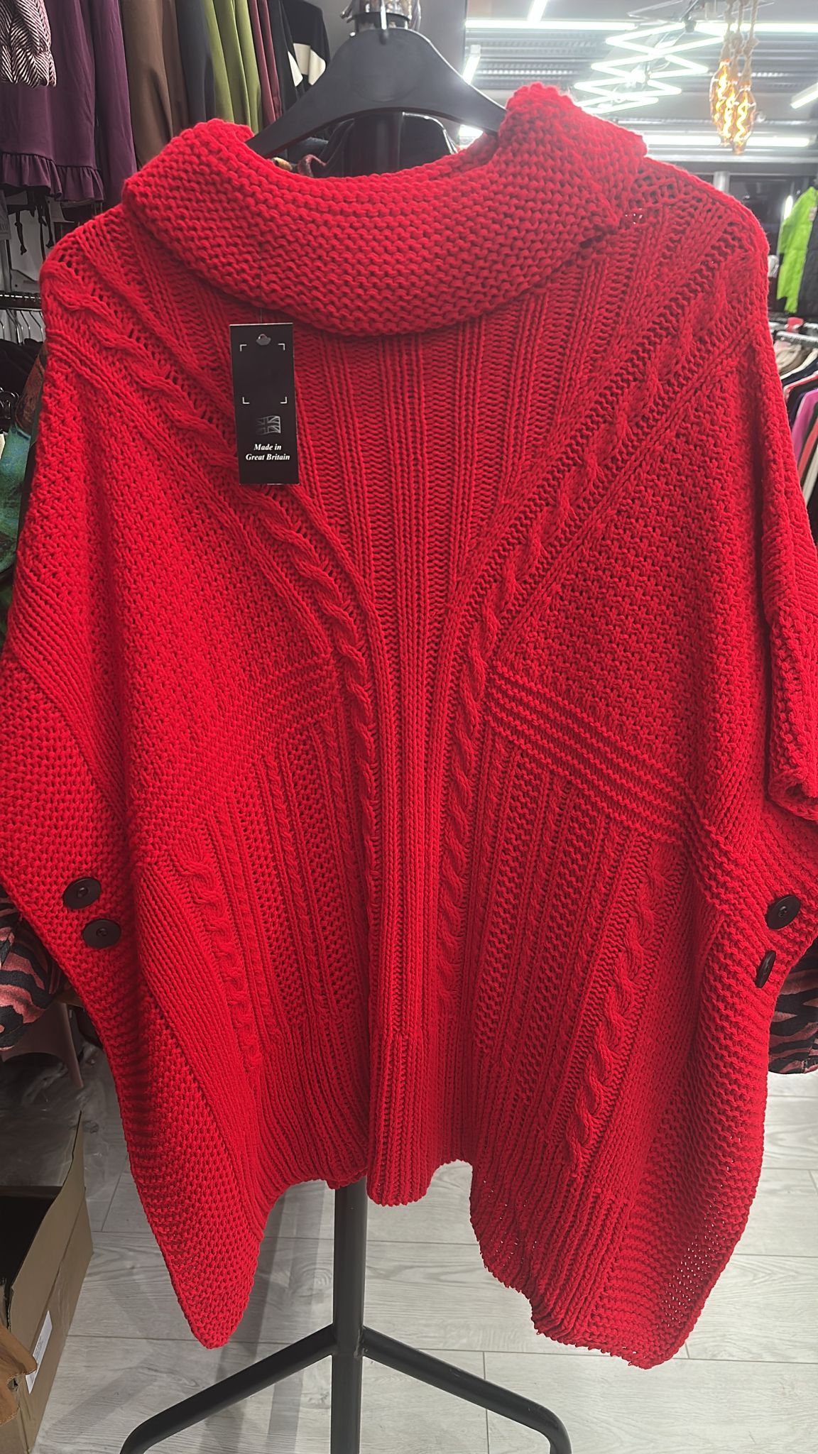 A striking luxury knit wrap in a vibrant scarlet tone, beautifully crafted with mixed stitch textures and sculpted cable patterns. Designed with a soft shawl collar and relaxed batwing silhouette for elevated winter layering.